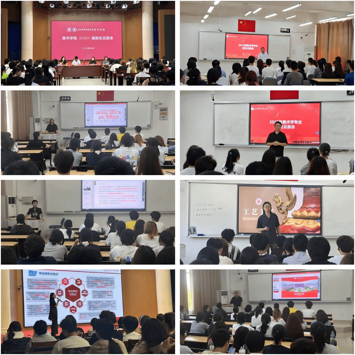 专业介绍环节,各系主任结合学科特色解读课程、实践与就业方向,展示“互联网+”“挑战杯”赛事佳作;院学科办解读学科及艺术硕士点培养方向、招生政策与成果,为新生考研指引方向。师资介绍环节,通过播放风采视频、邀请教授分享,让新生感受“队伍专业化”支撑,增强学习信心。