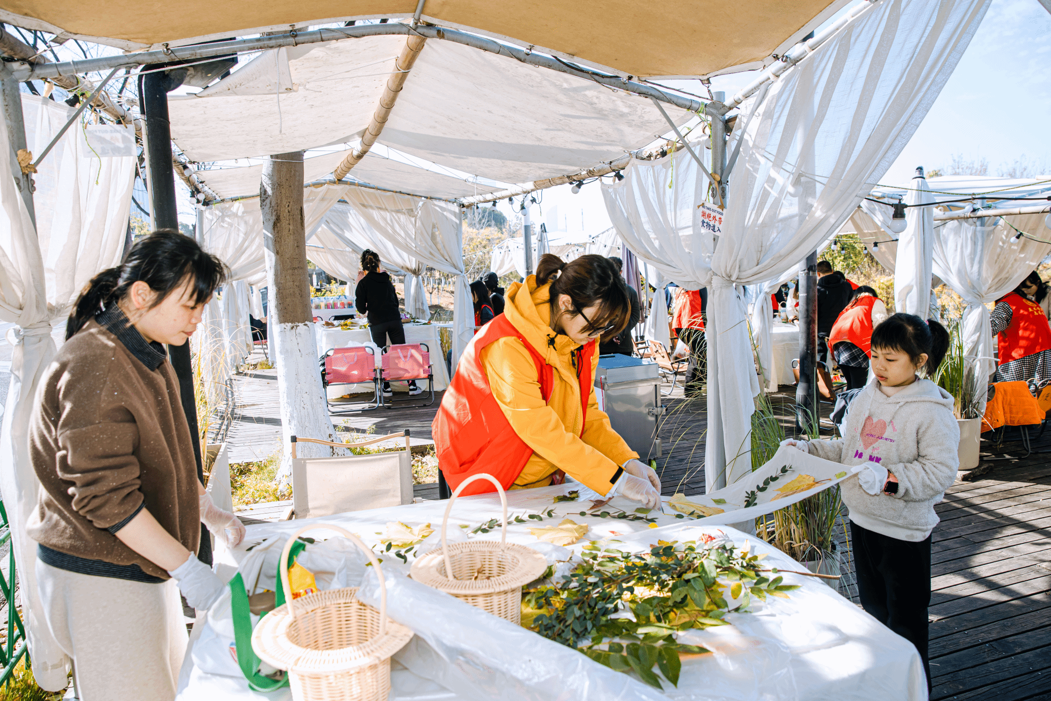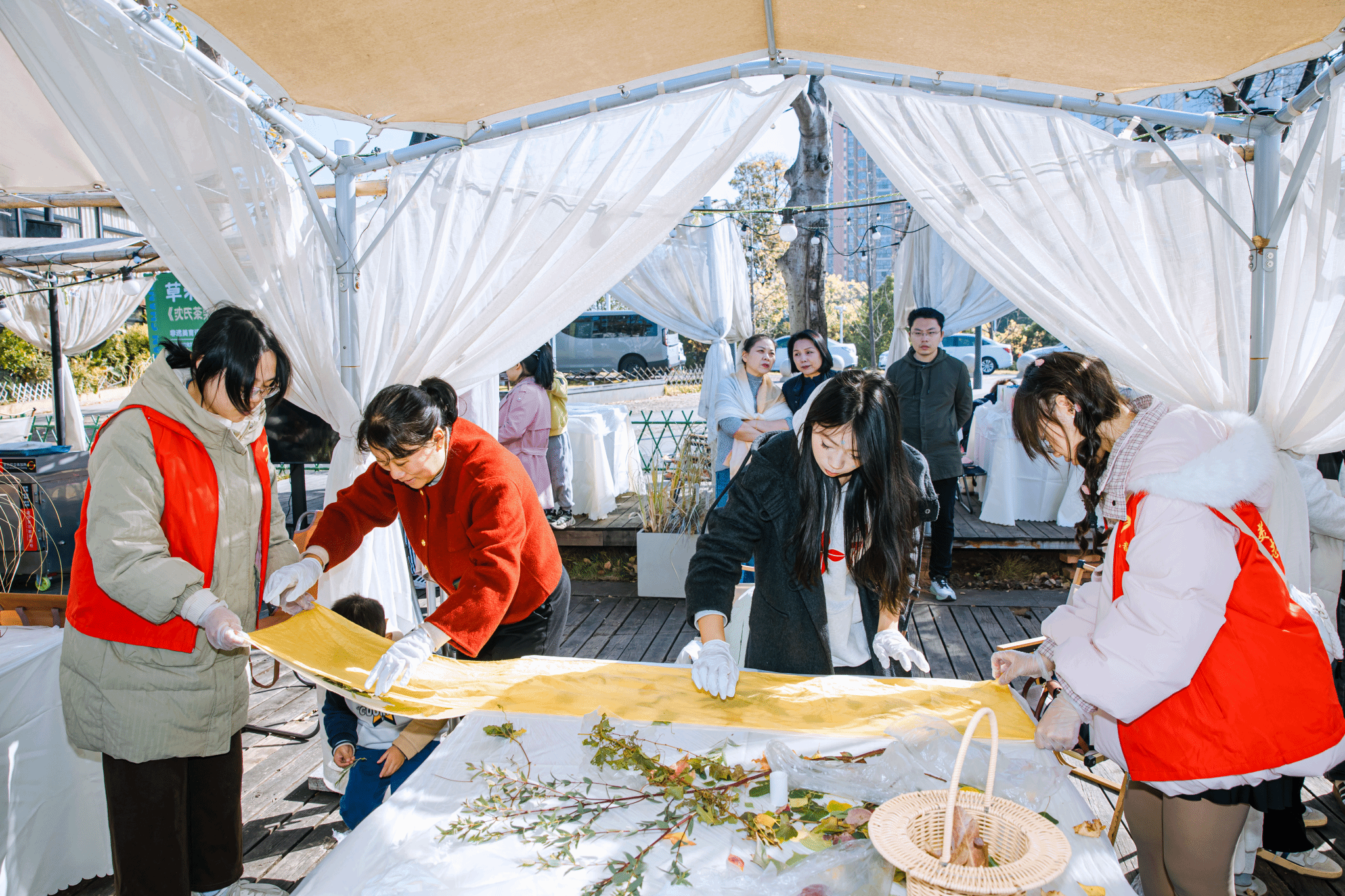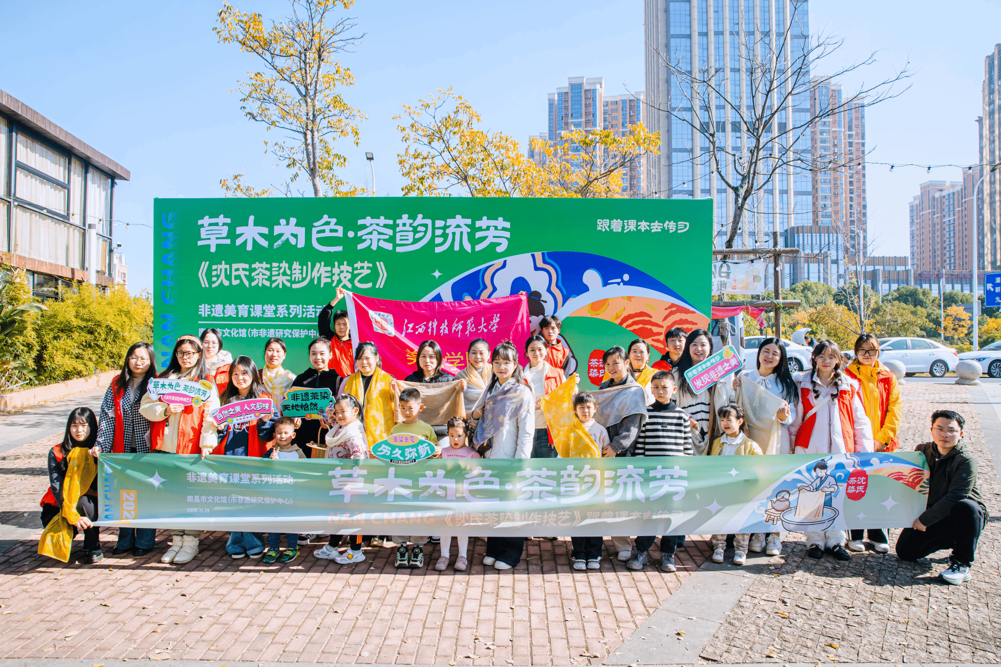 在实践体验环节,参与者们走进赣江岸边的自然环境中,亲手捡拾形态各异、色彩斑斓的花瓣与树叶,以柔软丝巾为创作载体,在工作室团队的专业指导下进行创意绑扎。