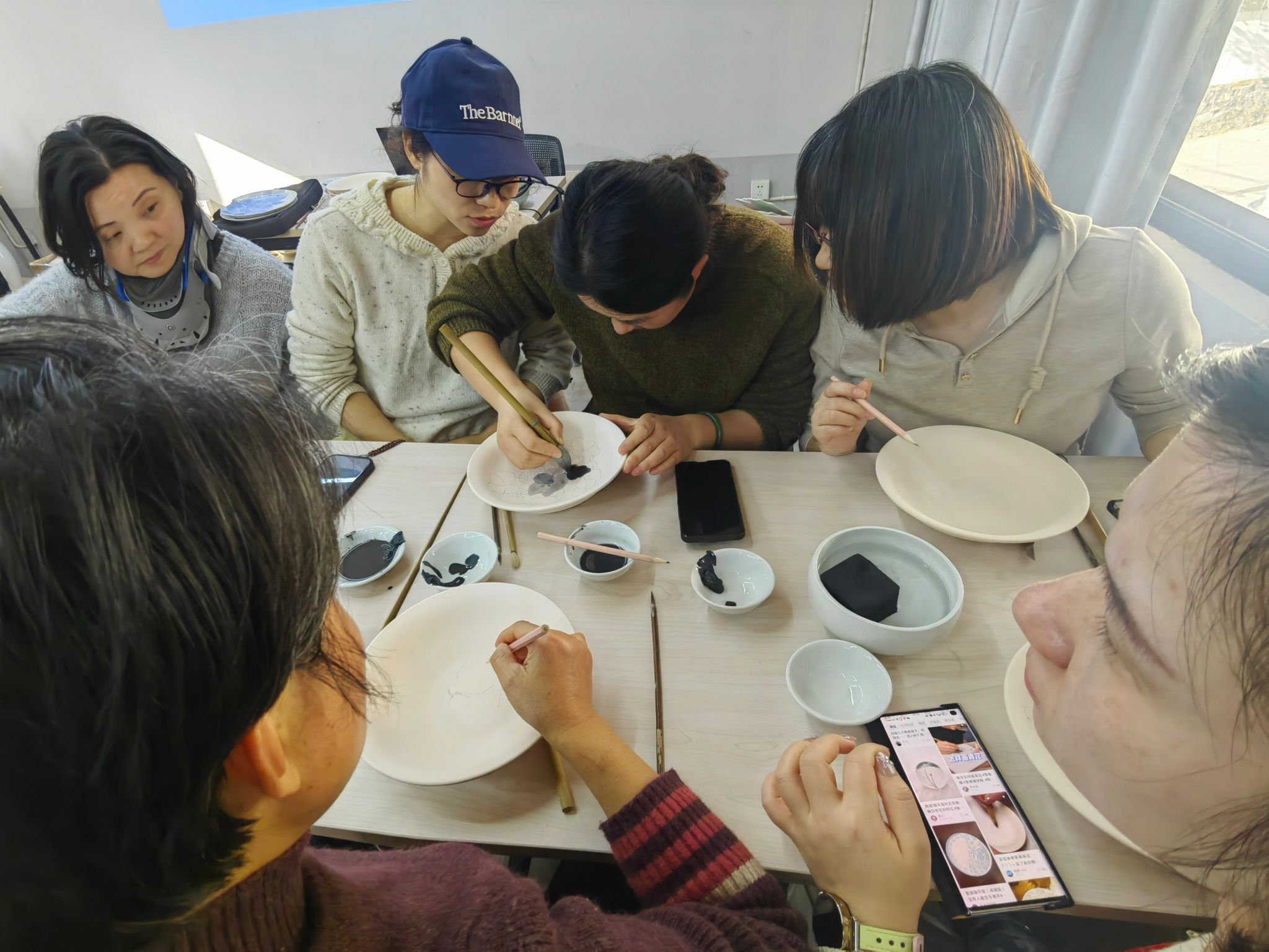 随后,团队前往“千年瓷都”景德镇,开启陶瓷文化沉浸式体验之旅。在专业陶艺工作室内,平日里传授美术技巧的老师们化身认真求学的“学员”,在当地工艺师的悉心指导下,完整经历构图、勾线、分水、罩色等工序,亲手绘制出一件件兼具个人风格与传统韵味的青花瓷盘。