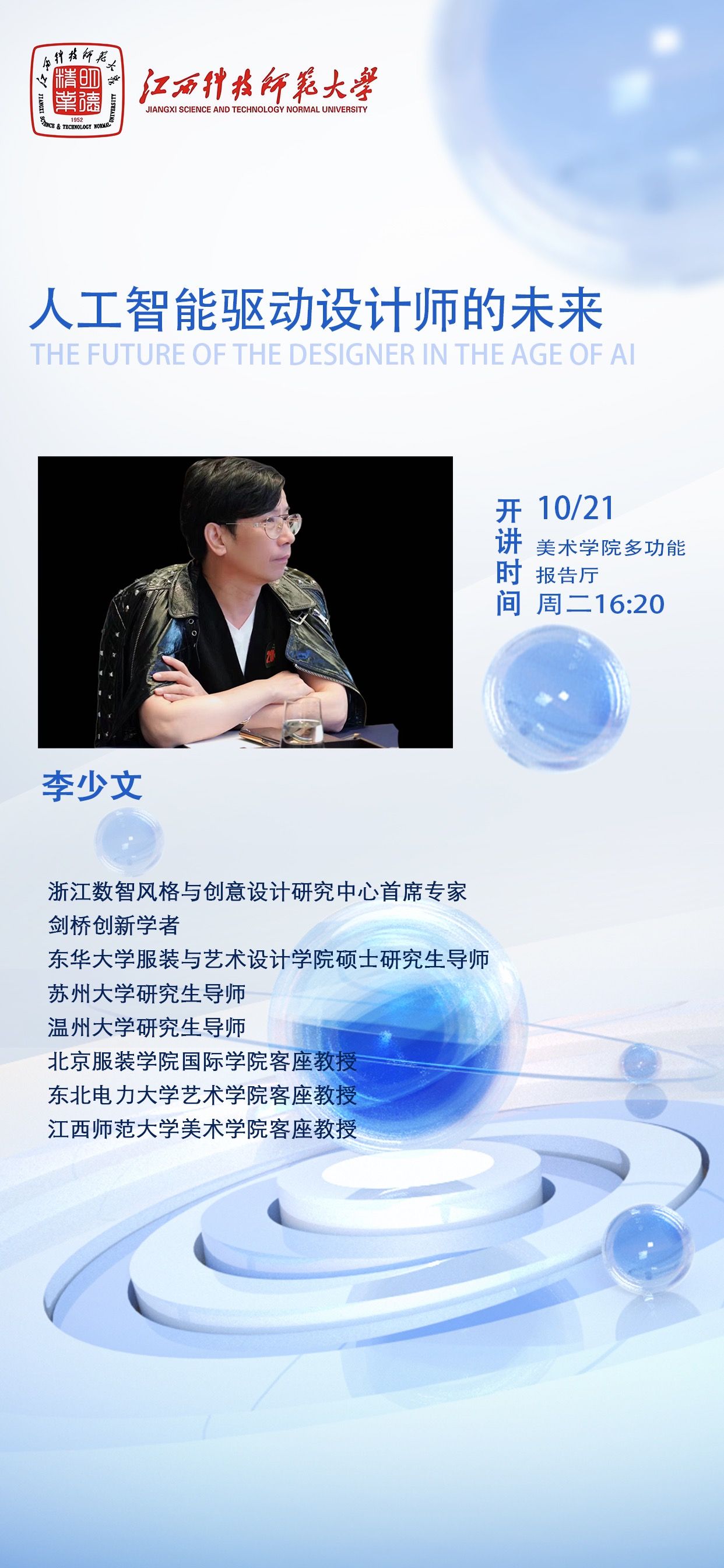 【专家简介】李少文,浙江数智风格与创意设计研究中心首席专家,兼任中欧时尚研究院时尚EMBA校友导师、东华大学服装与艺术设计学院硕士研究生导师、苏州大学研究生导师、浙江理工大学服装学院校外导师、温州大学研究生导师、北京服装学院国际学院客座教授、东北电力大学艺术学院客座教授、江西师范大学美术学院客座教授。荣获伦敦艺术大学-中央圣马丁艺术设计学院“全球时尚CEO”荣誉、剑桥创新学者等称号。