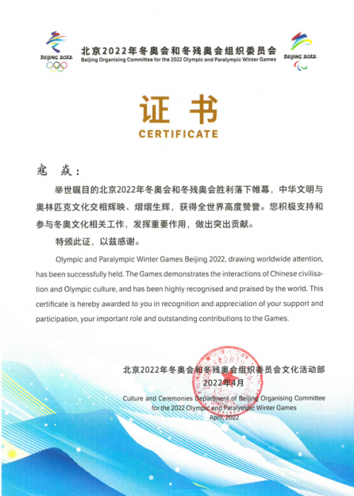 2022年北京冬奥会既是全球瞩目的体育盛会,也是一场文化盛宴。近日,江西科技师范大学教授、江西省美协漆画艺委会主任寇焱收到了北京2022年冬奥会和残奥会组织委员会文化活动部发来的证书,对寇焱在北京冬奥会和冬残奥会期间的文化工作以及突出表现表示感谢。